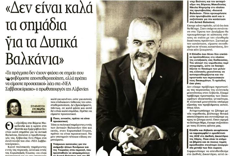 “Gjërat nuk kanë arritur në atë pikë që të kemi frikë nga destabilizimi, por duhet të jemi të kujdesshëm”, tha kryeministri shqiptar për gazetën “ TA NEA” në numrin e fundjavës .