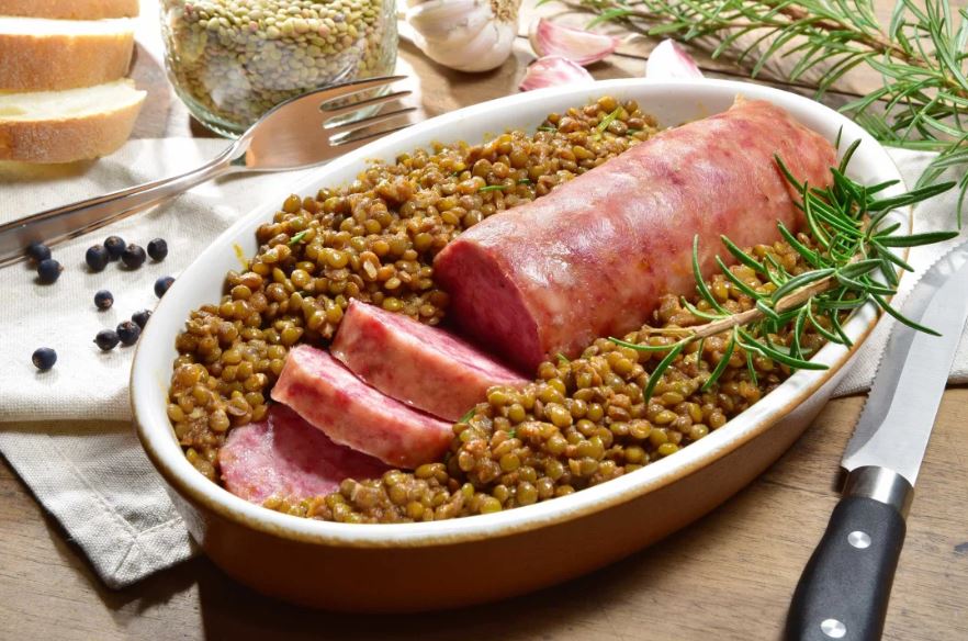 Italianët festojnë natën e vitit të ri duke konsumuar pjatën e tyre tradicionale me sallam dhe bizele, për të pasur mbarësi dhe para. Vakti përfundon me disa topa brumi të skuqur të lyer me mjaltë e sheqer pluhur dhe verë të bardhë të gazuar.