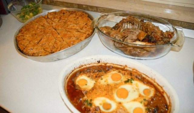 Byrek me barishte ose vezë dhe djathë, ose vezë me kos. Sallatat e çdo tipi, me perime të gatuara, të freskëta etj.
