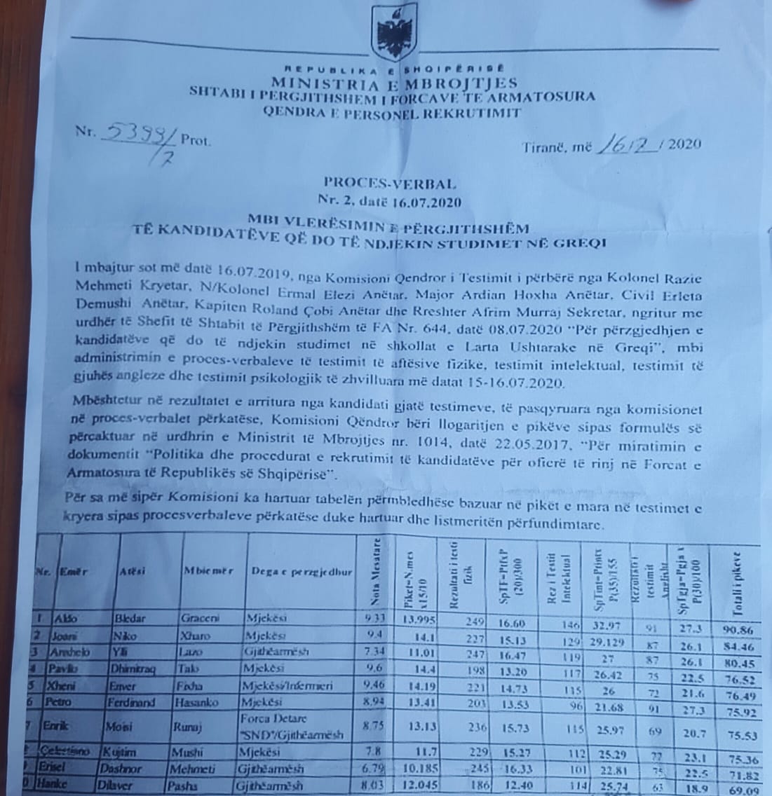 Pikët e testimeve nuk u morën fare në konsideratë nga Ministria e Mbrojtjes, duke e bërë kështu nul, gjithë testimin e bërë. Familjarët e djalit fitues Aldo Gracenit, thonë, se po përballen me presione të formave të ndryshme, nga njerëz, që kanë lidhje me personat e interesuar, në këtë aferë. Gazeta “Shqip” do ta ndjekë këtë çështje në vazhdimësi.