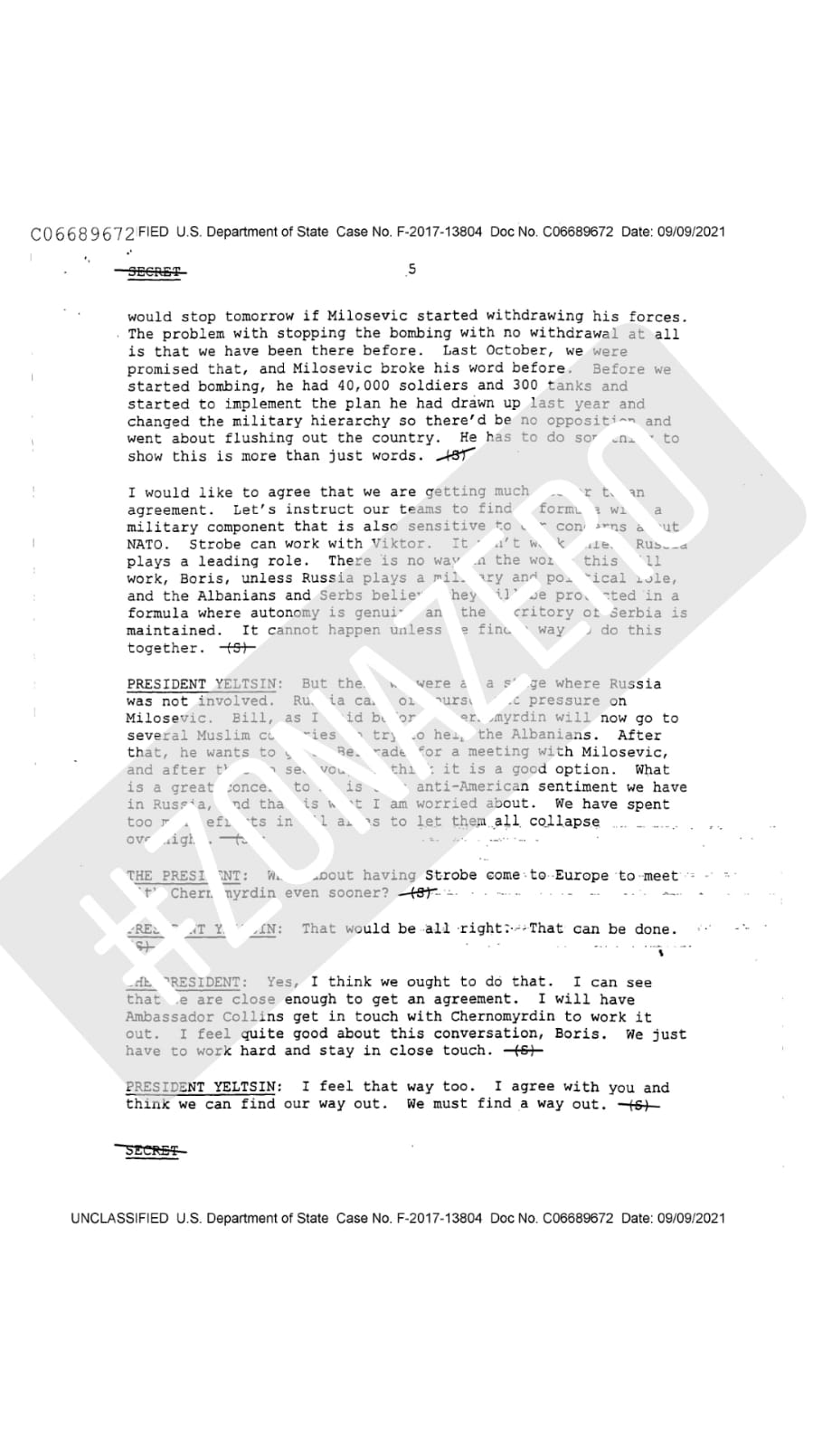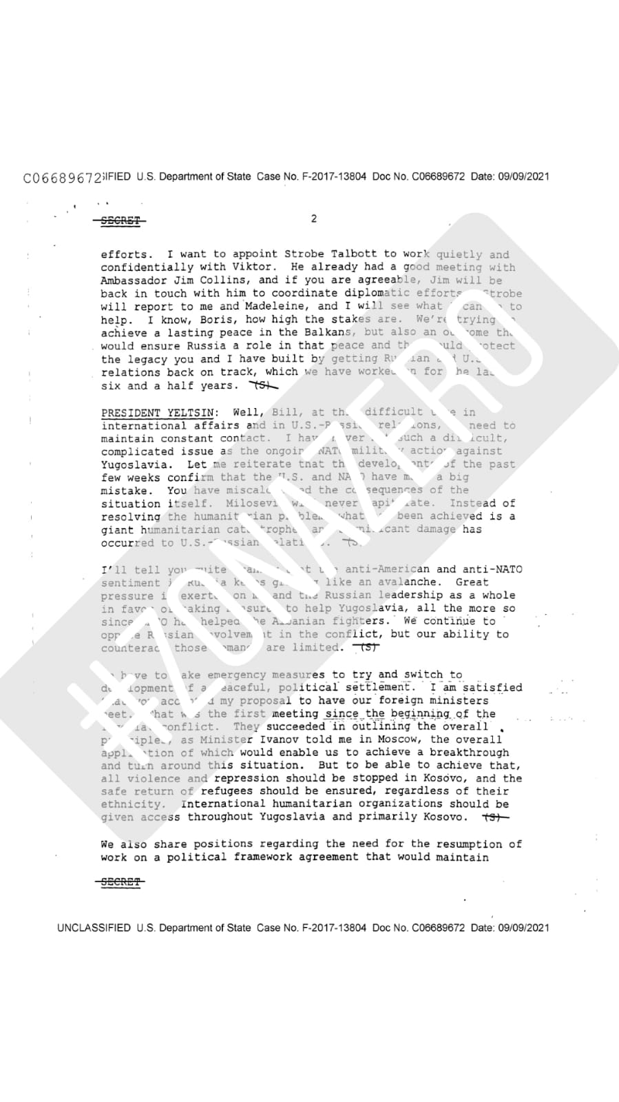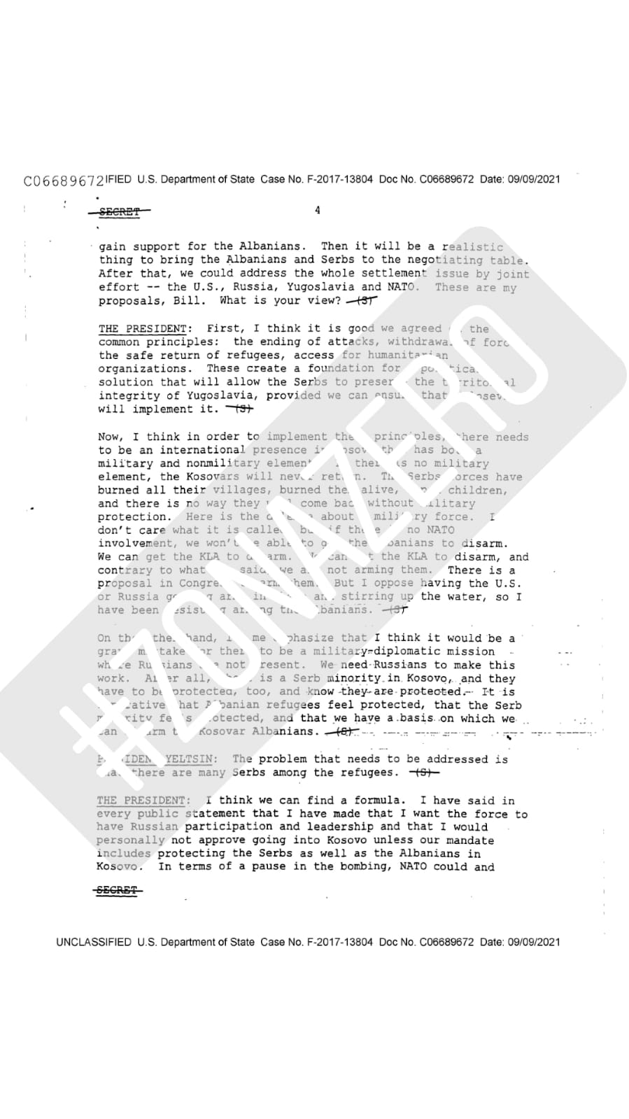 “Bill, mendoj se kemi nevojë për një udhëheqës të fortë shqiptar në Kosovë, në mënyrë që ta ulim në tryezën e bisedimit me Millosheviçin. Sigurisht, na nevojiten edhe sinjale nga NATO nëse duam të gjejmë në zgjidhje. Është e qartë se Jugosllavia nuk do ta pranojë kurrë një mision ushtarak, sidomos nëse udhëhiqet nga NATO”, deklaron Yeltsin.