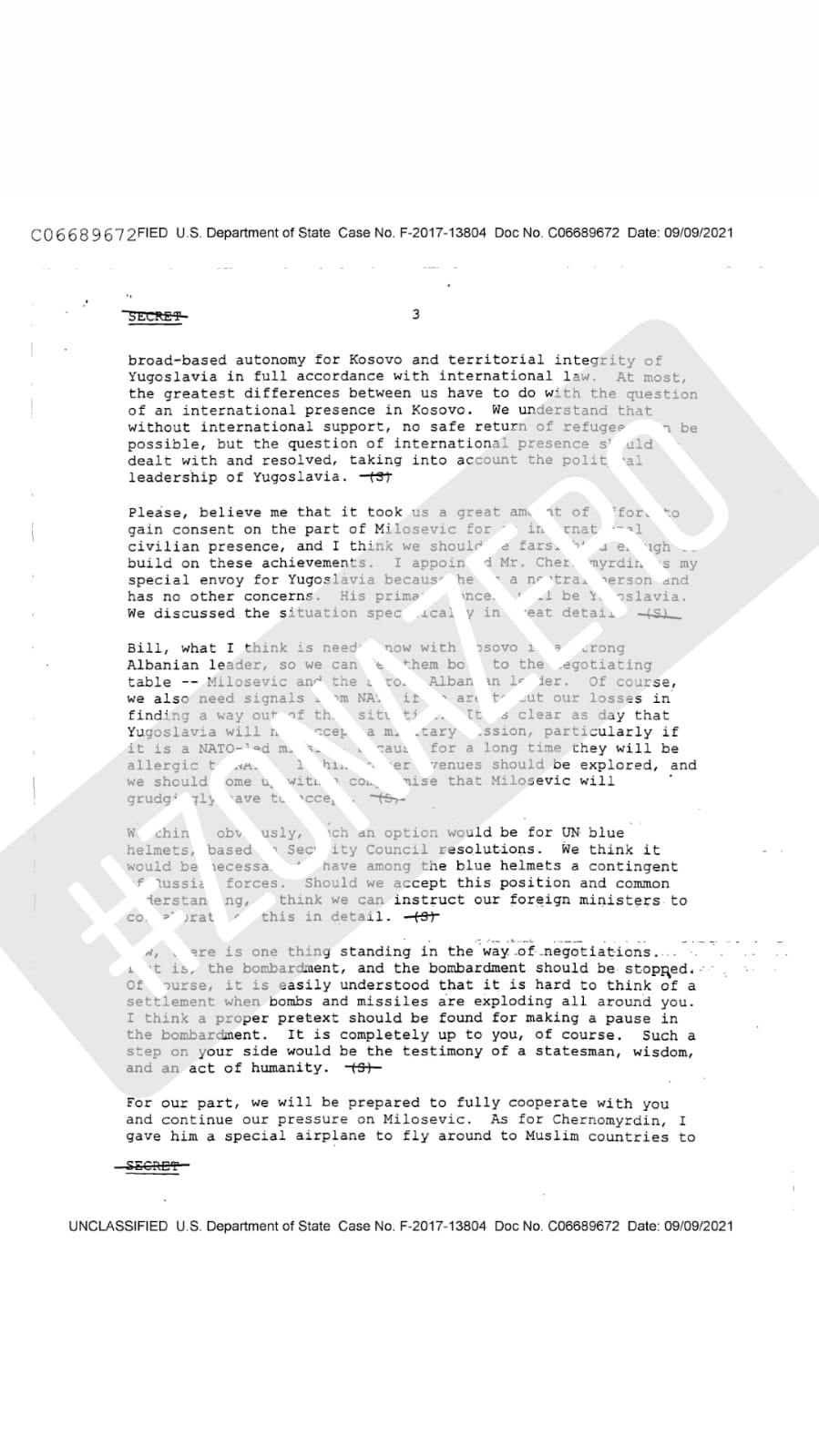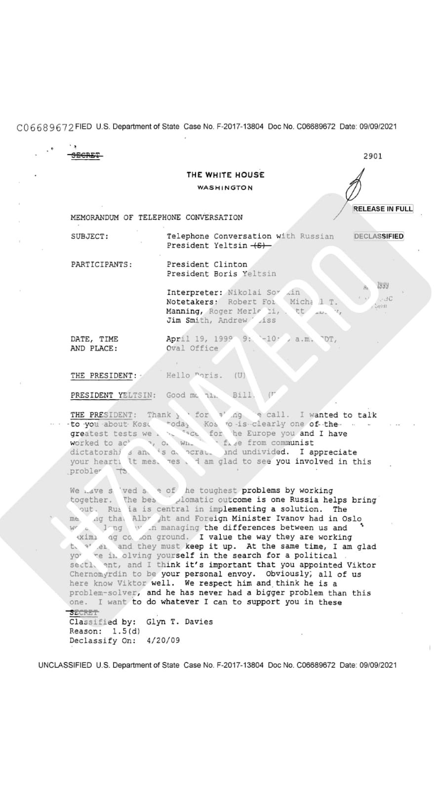 Yeltsin më pas njofton Clinton për emërimin e Viktor Chernomyrdin si të dërguar të tij të posaçëm për Jugosllavinë. Ai beson se shqiptarët dhe serbët mund të ulen në tryezë për të biseduar me një kusht.