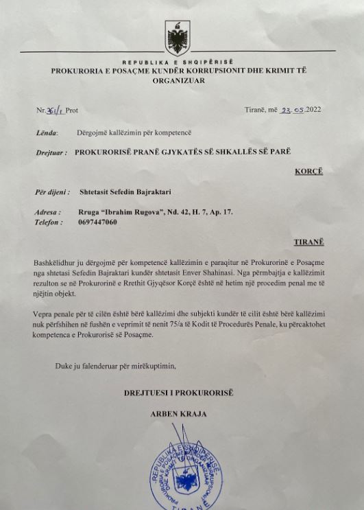 “Bashkëlidhur ju dërgojmë për kompetencë kallëzimin e paraqitur në Prokurorinë e Posaçme kundër shtatasit Enver Shahinasi. Nga përmbajtja e kallëzimit rezulton se në Prokurorinë e Rrethit Gjyqësor Korçë është nën hetim një procedim penal me të njëjtin objekt. Vepra penale për të cilën është bërë kallëzimi dhe subjekti kundër të cilit është bërë kallëzimi nuk përfshihen në fushën e nenit 75/a të Kodit të Procedurës Penale, ku përcaktohet kompentenca e Prokurorisë së Posaçme” thuhet në dokumentin, që mban në fund firmën e drejtuesit të SPAK, Arben Kraja.