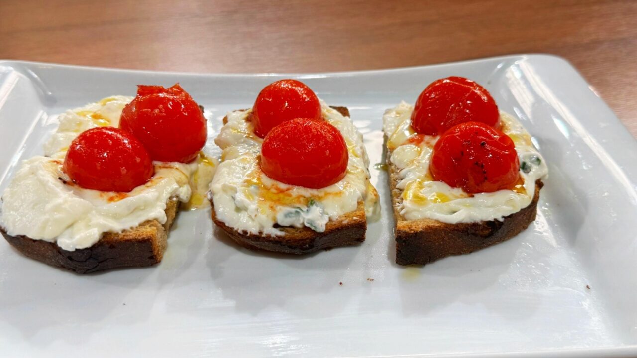 Brusketa me domate qershi dhe ricota është receta e zgjedhur sot nga Linda Fishta në programin “Në Shtëpinë tonë”. Është një antipastë e thjeshtë dhe e shijshme që mund të përgatitet për një drekë të shpejtë deri te një darkë festive. Ky kombinim i freskët i domateve qershi të prera, ricotës së butë dhe shijes delikate të vajit të ullirit krijon një harmoni të përkryer. Me një copë bukë të thekur, kjo recetë do t’ju sjellë freski dhe shije.