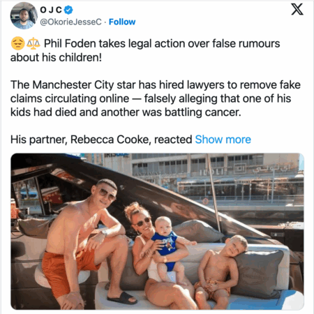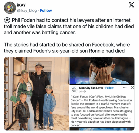 Njoftimet e rreme për fëmijët e tyre tronditën të gjithë planetin. Foto të krijuara nga inteligjenca artificiale (IA) të Foden dhe bashkëshortes së tij duke qarë dhe vajtuar me lajmin e sajuar për vdekjen e djalit të tyre gjashtëvjeçar Rooney filluan të përhapen në rrjetet sociale. Pas kësaj, pati një lajm të rremë se vajza e tyre vuante nga kanceri.