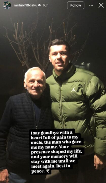 Futbollisti shqiptar Mirlind Daku po kalon një periudhë të vështirë personale, pasi ka humbur një anëtar shumë të dashur të familjes. Ai ka njoftuar ndarjen nga jeta të xhaxhait të tij përmes një postimi emocional në rrjetet sociale, duke prekur ndjekësit dhe opinionin sportiv.