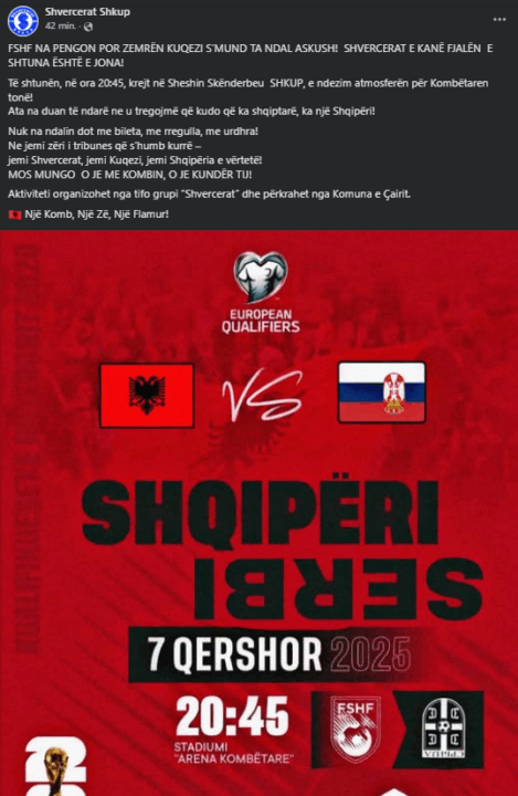 Nuk na ndalin dot me bileta, me rregulla, me urdhra! Ne jemi zëri i tribunes që s’humb kurrë – jemi Shvercerat, jemi Kuqezi, jemi Shqipëria e vërtetë! MOS MUNGO O JE ME KOMBIN, O JE KUNDËR TIJ! Aktiviteti organizohet nga tifo grupi “Shvercerat” dhe përkrahet nga Komuna e Çairit. Një Komb, Një Zë, Një Flamur!”.
