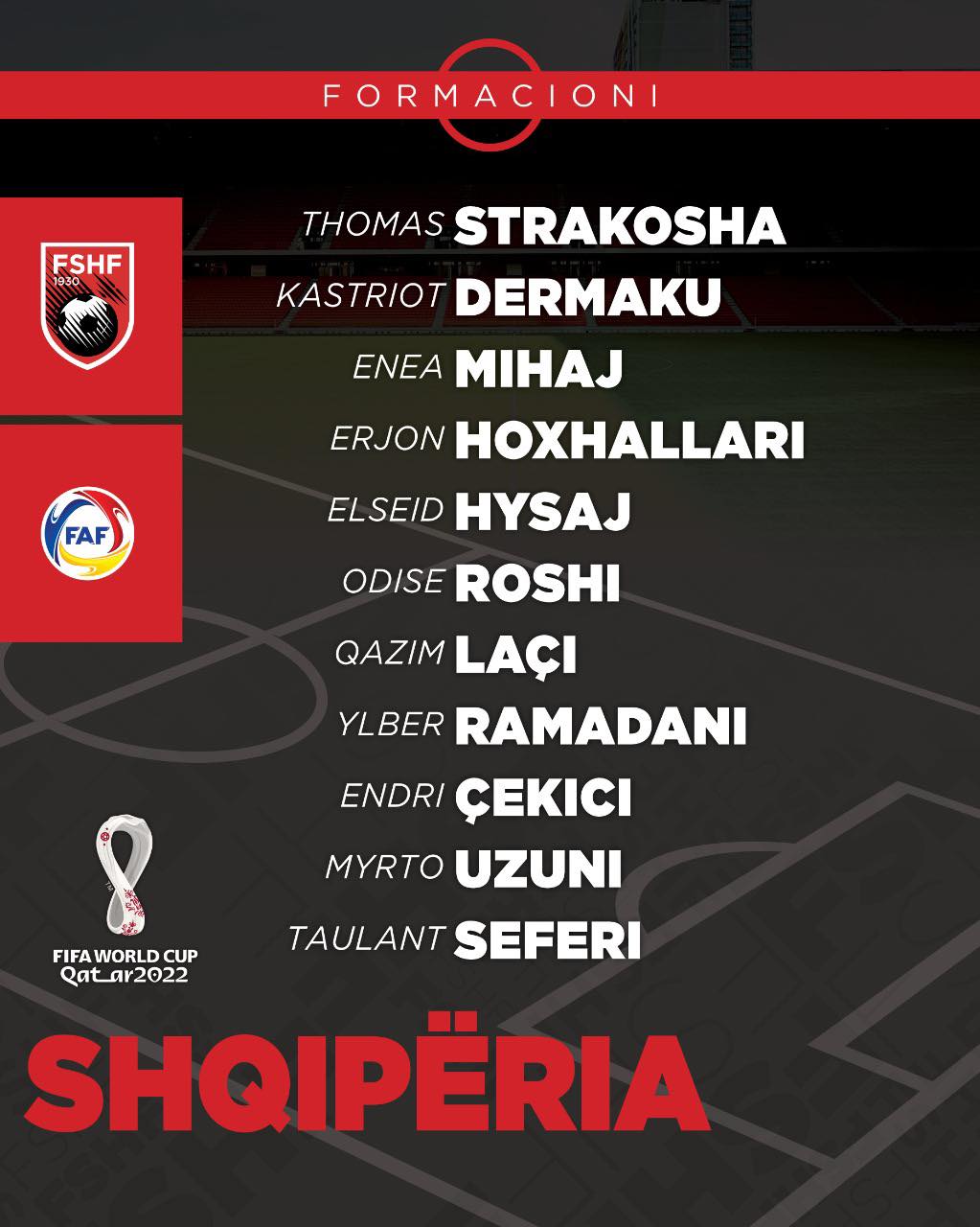 Në mesfushën me pesë lojtarë janë aktivizuar Roshi, Laçi, Ramadani, çekiçi dhe Hysaj ndërsa në sulm, Uzuni dhe Seferi.
