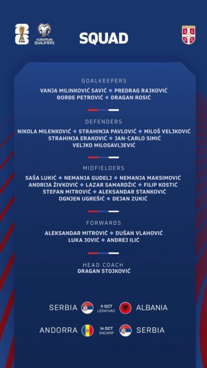 Federata Serbe e Futbollit ka shpallur listën e lojtarëve për ndeshjet kualifikuese të Botërorit 2026 ndaj Shqipërisë dhe Andorrës, që do të zhvillohen më 11 dhe 14 tetor.