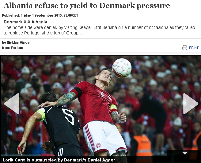 Barazimi me Shqipërinë në “Telia Park”, nuk është pritur dhe vlerësuar pozitivisht nga mediat daneze. Këto të fundit, kanë sulmuar dhe akuzuar trajnerin Morten Olsen, i cili “nuk ka ditur të jetë i mprehtë për të zgjedhur lojtarët e duhur për këtë sfidë”. E përditshmja “Extrabladet” ka shkruar se Danimarka “nuk ka cilësinë e duhur për të qenë mes skuadrave më të mira të Europës”. Ndërsa gazeta tjetër “TipsBladet”, kritikon trajnerin që drejton kombëtaren nordike prej 15 vjetësh, “pasi nuk është treguar i zgjuar për të lexuar ndeshjen dhe për të bërë zëvendësimet e duhura”. Po ashtu, 66-vjeçari ka qenë në qendër të kritikave edhe të mediave të tjera daneze, shumë prej të cilave janë habitur me deklaratat e tij, që në vend të merrej me ndeshjen, kishin të bënin me fotot e Ballist Morinës me lojtarët e kombëtares shqiptare. Edhe mediat italiane i kanë kushtuar një hapësirë kësaj ndeshjeje, duke vlerësuar italo-shqiptarin De Biazi. Ndërsa faqja e UEFA-s shkruan: “Shqipëria i rezistoi presionit danez, falë edhe Berishës, që i dha një pikë me vlera skuadrës së De Biazit”.