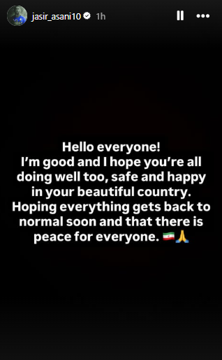 “Përshëndetje! Jam mirë dhe shpresoj që edhe ju të jeni mirë, të jeni të sigurt dhe të lumtur në vendin tuaj të bukur. Shpresoj që shpejt gjithçka të kthehet në normalitet dhe se ka paqe për të gjithë”, shkruante Asani në postimin e tij të shoqëruar me emojin e flamurit iranian dhe atë të lutjes.