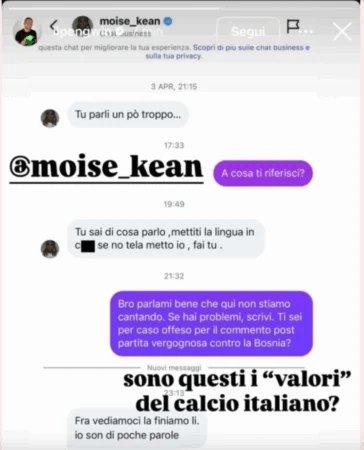 Por Pengwin e interpretoi atë si një provokim dhe e postoi të gjithë bisedën në një “Instastory” duke ngritur pyetjen: ‘Këto janë vlerat e futbollit italian?’ dhe më pas me një video në një postim tjetër e shtoi dozën: ‘Vërtet kemi arritur deri në këtë pikë? Një futbollist i Serie A që kërkon të intimidojë me prepotencë dhe ndjesinë e të qenit superior? Jam pa fjalë, por Moise gaboi gjithçka”, tha Pengwin që më pas iu drejtua futbollistit: “Vij nga uria, nga acidi i pishinave që më digjte gjunjtë dhe jeta më mësoi që respekti vjen përpara parave, famës dhe gjithçkaje tjetër. Reflekto. Kjo mënyrë nuk më përket dhe nuk duhet t’i përkasë asnjë futbollisti që ndonëse me rezultate të dobëta, aktualisht përfaqëson vendin tim. Por nëse këto janë vlerat e atij që na përfaqëson, filloj të kuptoj më mirë arsyen se përse Botërorin e shohim vetëm me dylbi”.