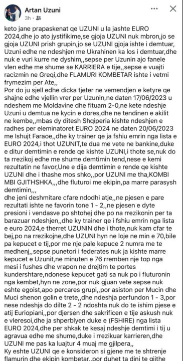 Artan Uzuni, babai i sulmuesit të Kombëtares, Myrto Uzuni, nëpërmjet një statusi të gjatë në rrjetet sociale u është përgjigjur të gjithë atyre që kritikonin paraqitjet e lojtarit në radhët e kuqezinjve.