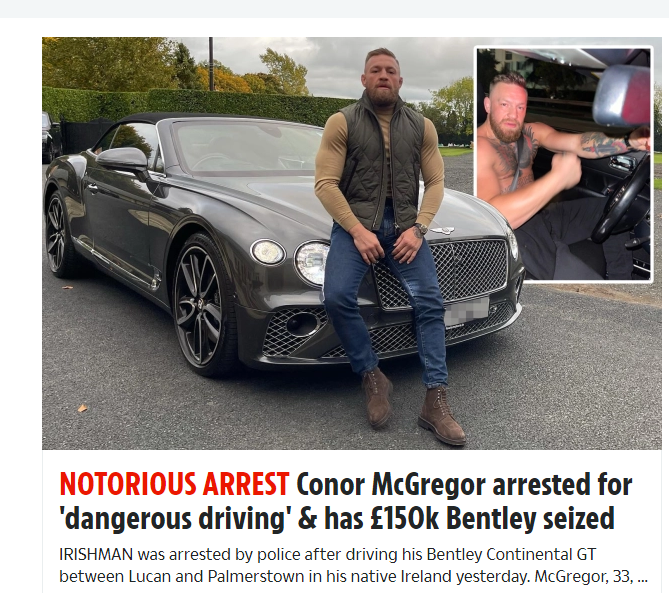 Conor McGregor ka përfunduar në prangat e policisë për shkelje të rregullave të qarkullimit rrugor, teksa udhëtonte me Bentley-n e tij, e cila kushton rreth 150,000 paund. Ngjarja në fjalë ka ndodur në një autostradë në perëndim të Dublinit.