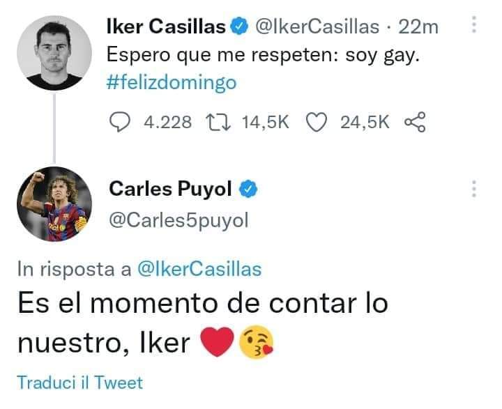 Nëpërmjet një postimi në Twitter, Casillas ka deklaruar se është gei, duke kërkuar respekt për prirjet e tij.