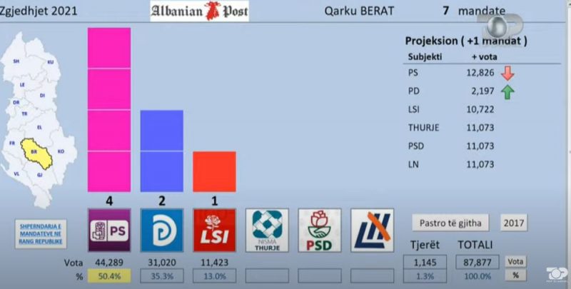 Në qarkun e Beratit, PS merr 4 mandate pasi 50.4% e qytetarëve kanë votuar për të majtët. Ndërsa LSI duket se ka humbur votuesit, pasi kanë votuar vetëm 13% duke i dhënë vetëm një mandat.
