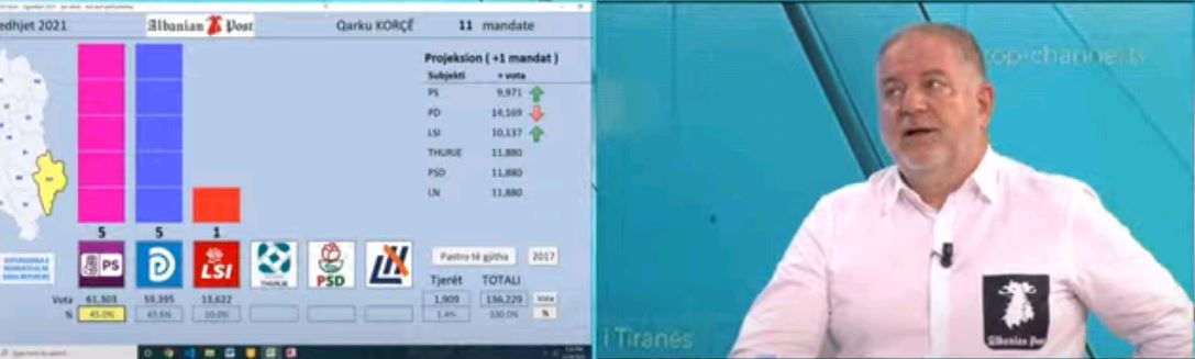 Baton Haxhiu deklaroi se janë katër qarqet ku mund të ndryshohet rezultatin e zgjedhjeve dhe ndarjen e mandateve. Në projeksionin e parë, PS merr 71 mandate, PD merr 63 mandate, ndërsa LSI 6 mandate. Asnjë parti tjetër nuk merr mandat tjetër.