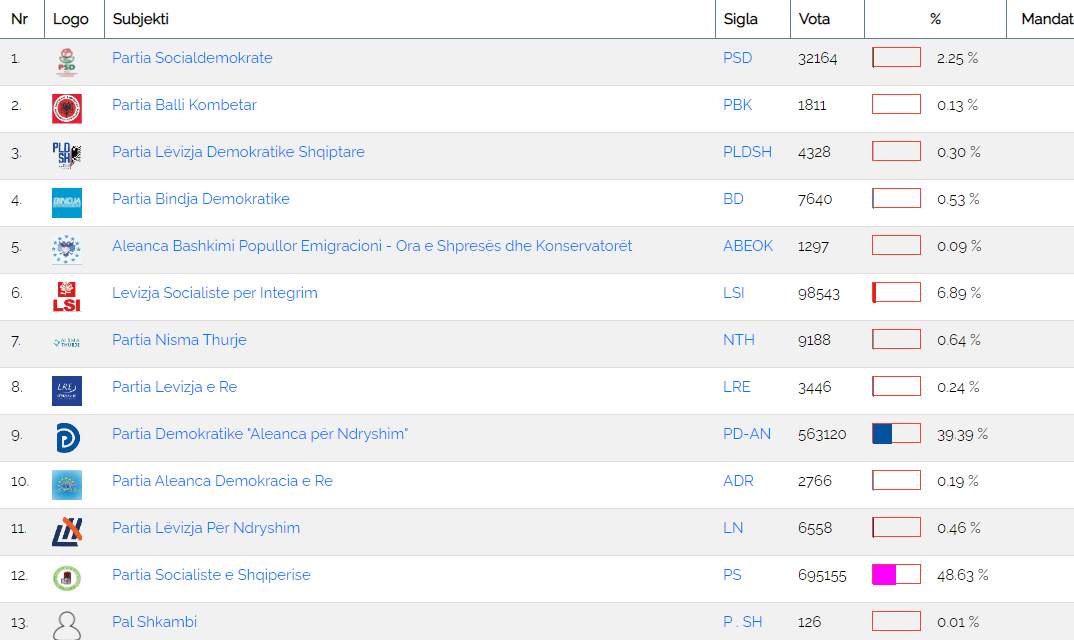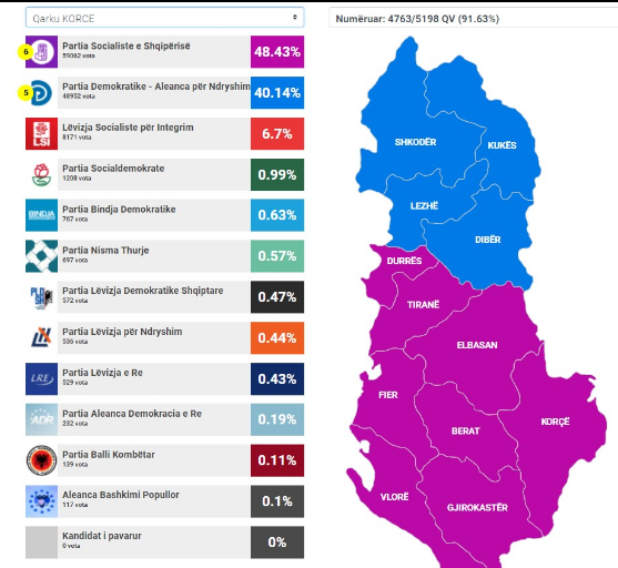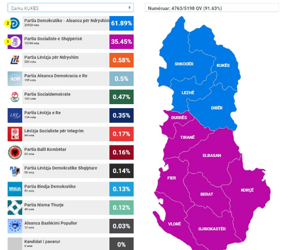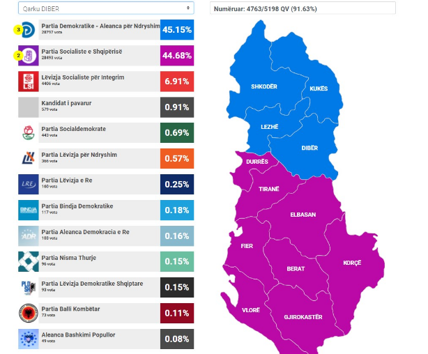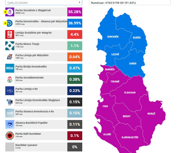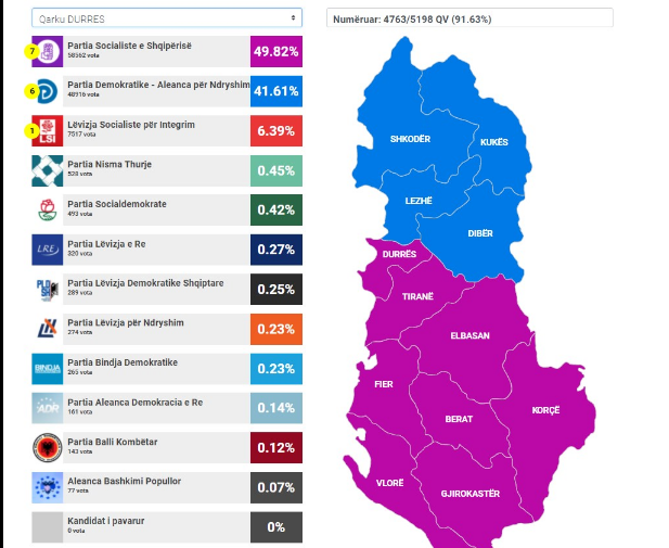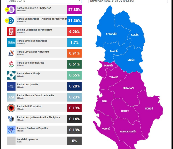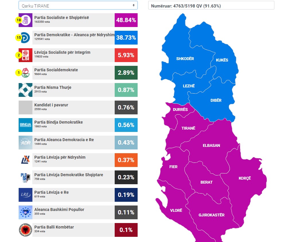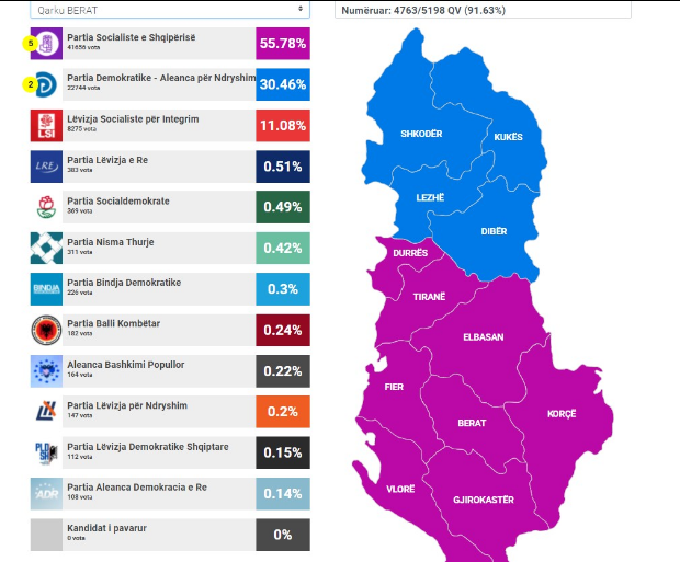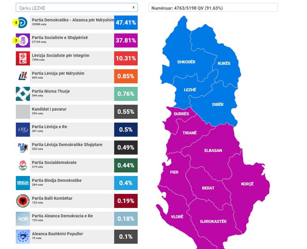 Ende pa u mbyllur këto dy qarqe, PS ka 73 mandate, PD 59, LSI 5 dhe PSD 3 mandate.