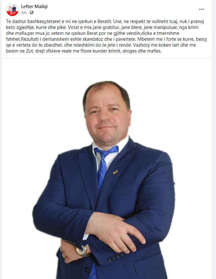 Kandidati i Lëvizjes Socialiste për Integrim, Lefter Maliqi, ka treguar përmes një postimi në rrjetet sociale, se kundërshton rezultatin e deritanishëm në Berat, por edhe në gjithë vendin.