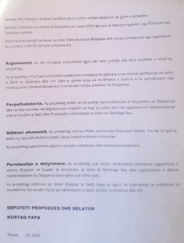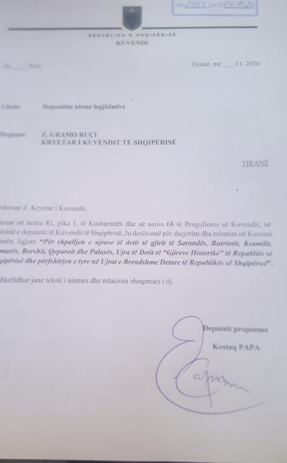 Drafti është paraqitur nga deputeti i opozitës parlamentare Kostaq Papa, i cili e depozitoi një muaj më parë, por më pas e tërhoqi për ta ripunuar.