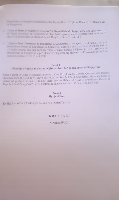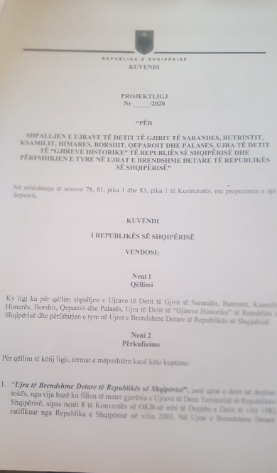 Sipas draftit, theksohet se ky ligj ka “për qëllim shpalljen e ujërave të detit të Gjirit të Sarandës, Butrintit, Ksamilit, Himarës, Borshit, Qeparoit dhe Palasës, Ujëra të Detit të ‘Gjireve Historike’ të Republikës së Shqipërisë dhe përfshirjes së tyre në Ujëra të Brendshëm”.